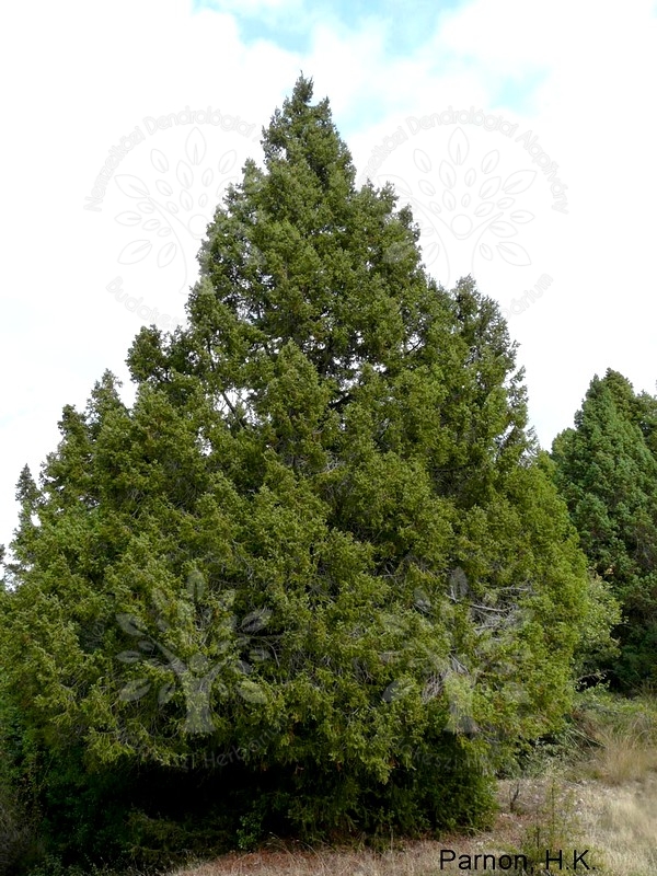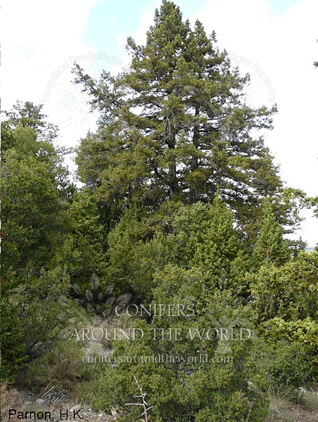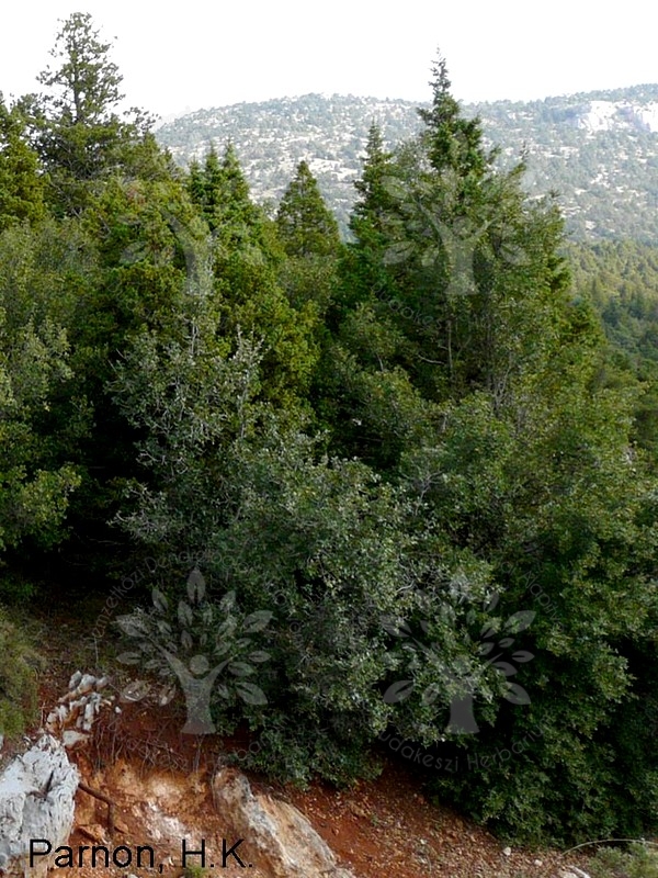 The following notes are from our colleague Kálmán Huber (Pécs, Hungary), who worked with us on Conifers Around the World and recently visited the location of this plant in the Parnon mountains in Arkadhia (Peloponnesos Peninsula). In the lower ranges of the Parnon the vegetation is typically mediterranean maquis dominated by evergreen shrubs. Higher up, from about 800 m a.s.l., conifers take over, including Abies cephalonica and Pinus nigra subsp. pallasiana, with evergreen oaks in the shrub layers. Locally, around 900 m, especially near Malevis Monastery, Juniperus drupacea is a dominant element with many trees reaching 10 m in height and trunk diameters up to 70 cm. Photographs from this location by Kálmán are marked "Parnon, H.K."