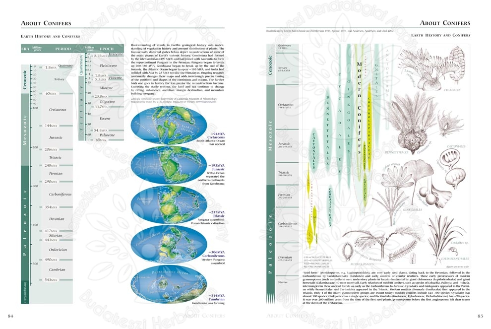 Conifers in Earth History shows simplified charts of Earth’s plate tectonic history accompanied by charts of the geologic timescale and a timescale of gymnosperm paleontology, with illustrations of reconstructed ancient forests.