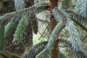 This fir usually has small (less than 6 cm long) but very attractive cones with the dark blue-gray cone having relatively large, long-exserted, broad-winged, showy bracts. This example is from Benmore Botanic Garden, R.B.G. Edinburgh.
