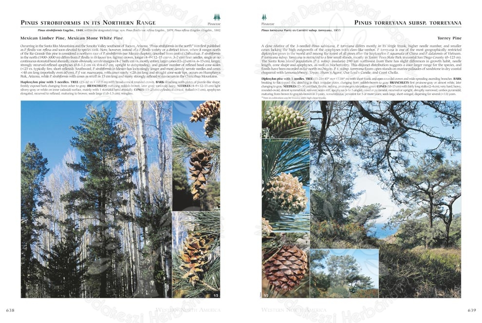 Full-page taxon profiles (see samples below) are the backbone of each regional chapter. The text describes the location where the taxon occurs, including elevational range, distinguishing characteristics, description of typical habitat and associated taxa; historical or cultural notes and data for champion or exceptional trees where pertinent and space permitting. The morphological description provides a concise technical description of the most important characters: habit, foliage, and cones, the last including seed description/size where pertinent. The photographs (with few exceptions) include a large habit photo, occasionally with insets, and smaller photos showing closeups of foliage and cones. In the few cases where the bark is particularly important for identification, a bark photo is also included here; otherwise, bark photos are grouped separately in the back matter (see Bark Gallery in the menu).